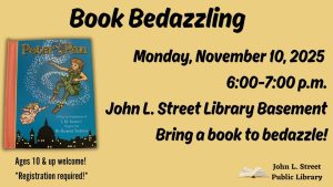 Join us in the library’s basement on Monday, November 10, 2025 at 6:00 p.m. to bedazzle a book.