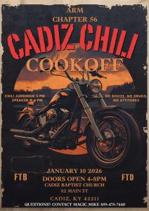 Join us Saturday January 10, 2026 for the Cadiz Chili Cookoff.