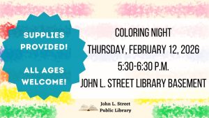 We are hosting a Coloring Night on Thursday, February 12, 2026 from 5:30-6:30 p.m.