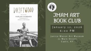 MAM is planning to reinstate the quarterly ART BOOK CLUB that was held in the past. We would like to invite everyone that is interested to join us. The next meeting will be Monday, January 12, 2026 at 6 pm in the lobby of the Janice Mason Art Museum. We will discuss “Driftwood: the Life of Harland Hubbard” by Jessica Whitehead. Come join us!