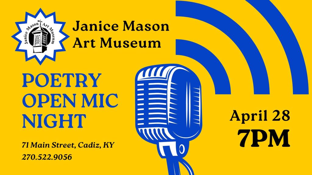 Janice Mason Art Museum will be hosting a Poetry Open Mic Night on Monday, April 28, at 7 PM, as we celebrate Poetry Month! Come and share your original piece of poetry or your favorite poem or just enjoy creative, lively community voices. Meet friends and connect with others who appreciate poetry as art. Refreshments will be served. Event is free and open to all who celebrate poetry.