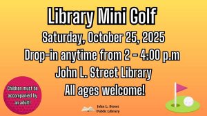 Drop-in anytime from 2:00 – 4:00 p.m. on Saturday, October 25 for Library Mini Golf!