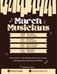 Live music in our granary bar every Friday and Saturday starting at 6:30p.m.