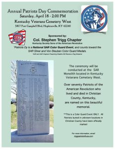 All are invited to a Patriots Day Commemoration honoring over 70 Patriots of the American Revolution – April 18, 2:00 PM at the Kentucky Veterans Cemetery West.