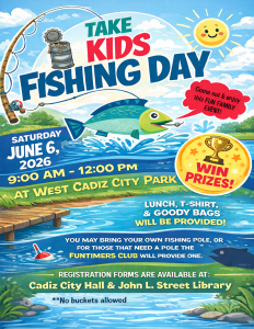 Take your kids fishing day is Saturday June 6, 2026 at West Cadiz Park.